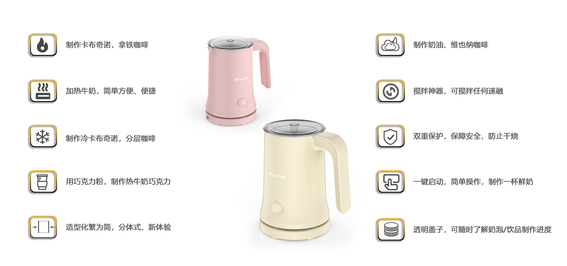 2、搅拌器与杯盖一体式设计,搅拌器360°旋转漩涡起泡,奶泡绵密细腻.